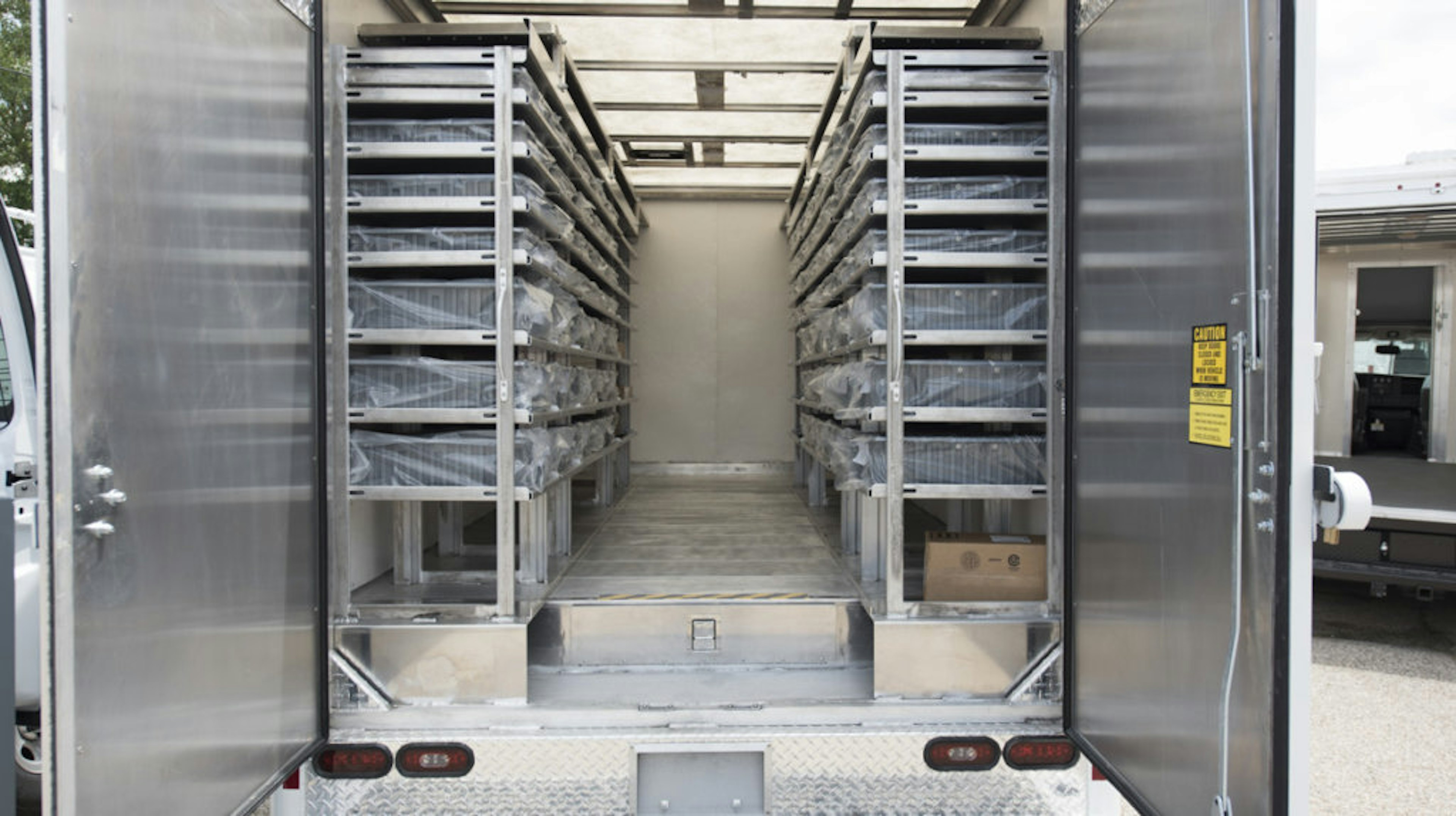 Interior of this box body is organized with shelves, pull out drawers, and bins.